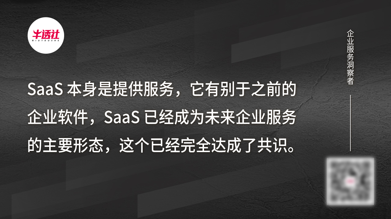 SaaS 本身是提供服务,它有别于之前的企业软件,SaaS 已经成为未来企业服务的主要形态,这个已经完全达成了共识。前段时间有消息称,大型商业银行把 SaaS 采购变成了重要方向。随着金融行业的应用,会快速辐射到各行各业。?