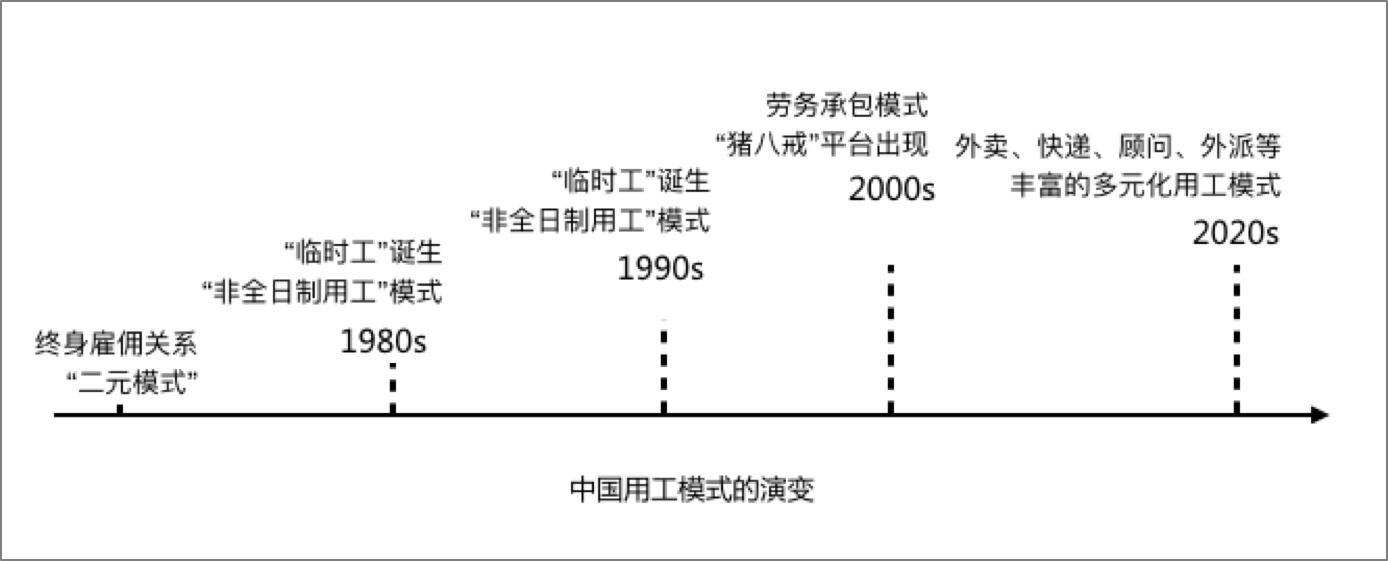 多元化用工在国内经历了几十年的演变,随经济环境的变化才发展到现在这样丰富的用工模式。简单地看看整个历程: