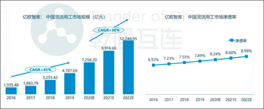 2020 年,中国多元化用工模式爆发式增长。据亿欧智库测算结果显示,2019 年国内灵活用工市场规模 4787.69亿元,年均复合增长率达 45%。在疫情影响和政策推动下,预计 2020 年国内市场规模约 7258.2 亿元,灵活用工市场渗透率为 8.24%。