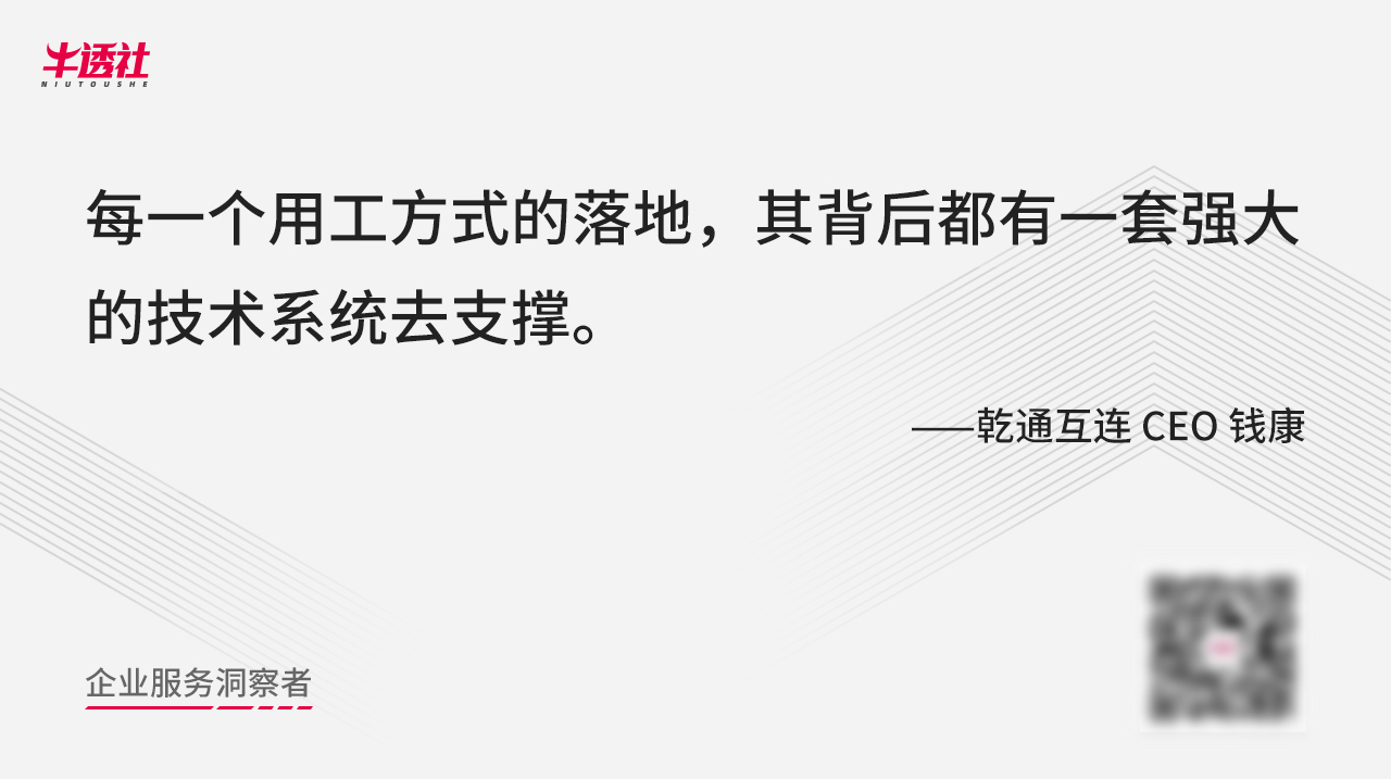 对于乾通互连来说,技术(AI、区块链)能力,加上基于核心团队十几年的外包服务能力和资源沉淀,成为解决企业招聘、人员管理问题的优势。从招人、入/离职合同签署,到考勤、缴税、薪资福利发放,实现企业多元化用工相关的全流程管理。