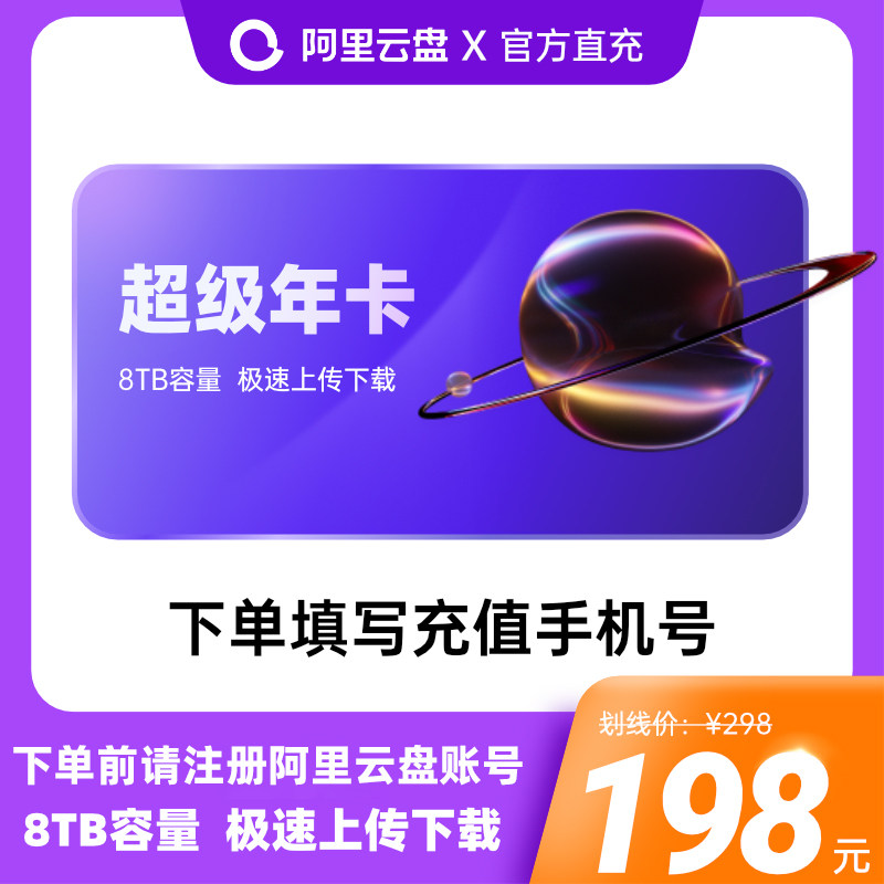 阿里云盘超级会员 12个月SVIP年卡8TB容量极速下载 手机号充值