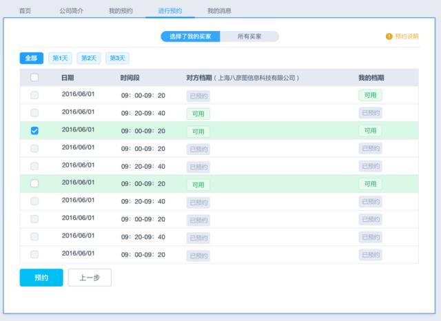 比如有一个适龄单身男程序员(买家),在相亲(参展)前,他会收到一份全部相亲对象的信息表,里面包含女方(展商)身高、体重、户口、收入、发型等他所关注的一切条件,他可以选择你所倾慕的对象点击选择时间点击预约按钮申请约谈,参与相亲的女性(展商)同样会收到一份全部相亲男性(买家)的信息表,进行选择,如果刚好匹配,系统即会自动分配时间撮合二者见面。有效避免了你要找个1米7的黑长直御姐,而相亲对象是个1米5双马尾萝莉的无意义尬聊。(将身高体重等条件换成产品、公司名称,规模等信息,让展商与买家在互相了解了的情况下实现高效约谈。展前预约阶段能够完成预约日程的60%左右)