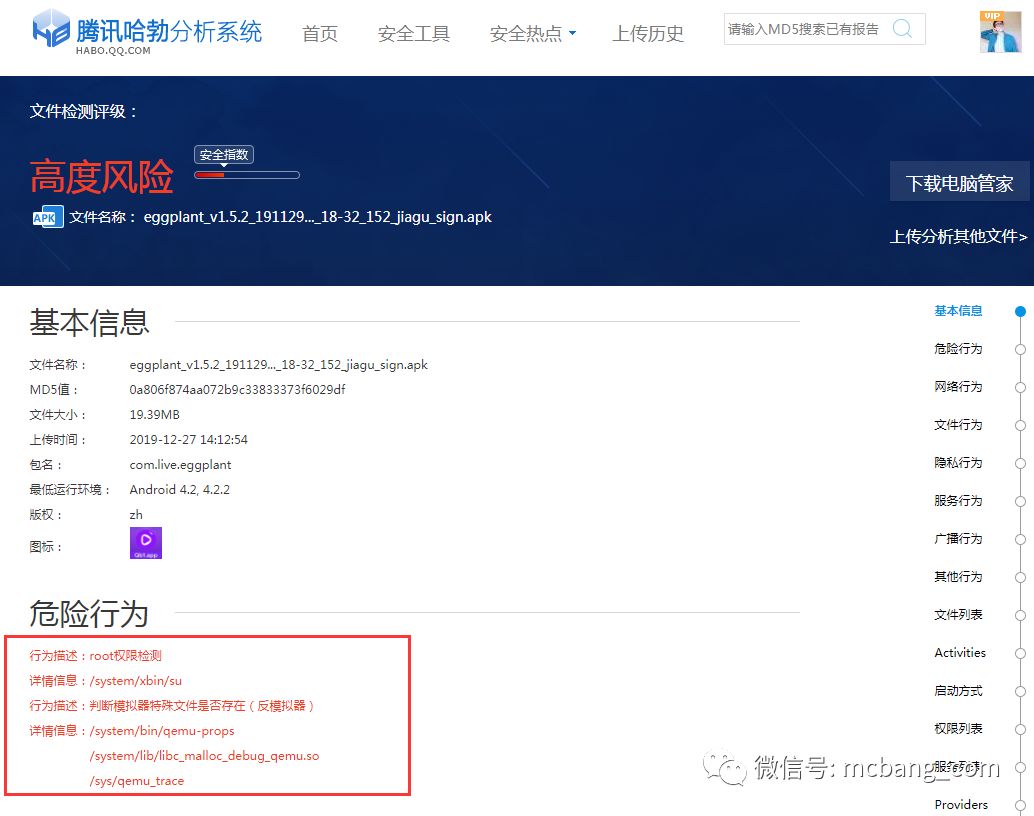 这样的安卓包,简单粗暴丢到腾讯哈勃上进行一个检测,已经被报告高度风险。eggplant_v1.5.2_191129_release_2019_12_04_18-32_152_jiagu_sign.apk