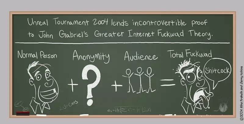 有人总结为这是因为「网络去抑制效应」,即使是一个正常人,当他在「匿名」的保护下,躲在屏幕后面,他就极有可能变成一个「网络混蛋」。 「网络混蛋理论( Greater Internet Fuckwad Theory)」说,当给予一个总体上正常的普通人「匿名性」以及「被迫收看的观众」时,他将会变成一位彻头彻尾的「混蛋」,在网络上展现出各种反社会以及精神病态者般的行为。但是,为什么会产生这么多「网络去抑制」的行为?
