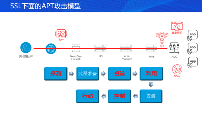 以SSL下的APT攻击模型为例,攻击过程中会涉及到探测、武器准备、投送、利用、安装、控制、行动这一系列行为,这些行为有可能是BOT利用登录凭证产生,也可能是因业务之间API调用产生,但在此探测、投送、利用、控制、行动的工程中,所有数据都可能会被加密,这就可能导致安全团队精心布局的安全体系中出现一个漏洞。另外,APT攻击中常用的水坑攻击和类似的针对信息泄露的攻击当中,绝大多数的鱼叉钓鱼、仿冒网站都因使用数据加密传输而无法得到完善的检测防护,因此无论企业的安全更加注重对外来访问的防御还是由内部对外的访问,部署在边界的安全设备在万物加密的时代依然存在巨大的盲点。
