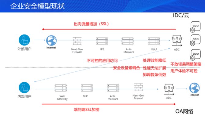 再次,对于由OA网络产生的出向访问流量,同样部署相应的安全设备,尽管这些安全设备没有很好的发挥对加密流量的防护作用,但F5的安全业务优化平台将优化其防护性能。