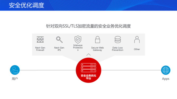 通过多年来的实战,F5已经形成了一套日趋成熟的安全解决方案。面对复杂网络环境下客户希望其应用业务更快速、更智能、更安全的需求与当下安全模型紧耦合状态之间的矛盾,F5提出针对双向SSL/TLS加密流量的安全业务优化调度,实现流量可视化,解决菊链与安全设备对流量数据的加解密问题。在多种安全设备并存的条件下,安全技术或安全产品的接入并不受设备限制,因为F5安全业务优化平台所进行的安全防护与安全设备无关。