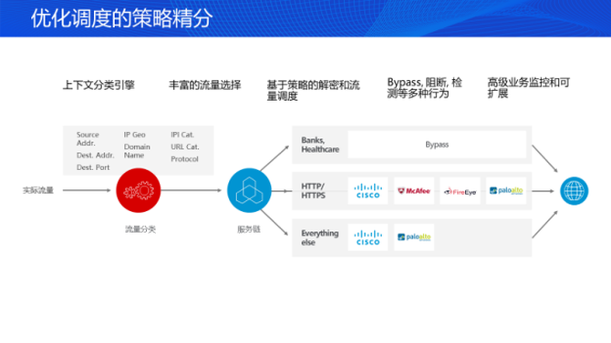 在F5的应用安全解决方案当中,流量精分是实现安全优化调度的关键所在,精分策略将被植入到整个业务链,形成安全业务链。安全业务优化平台将通过上下文分类引擎对实际流量进行分类,基于精分策略对业务流量加、解密后再进行流量调度,以此确认是否需要对所调度流量进行Bypass、阻断、检测等操作。同时,要确保安全业务链的高级业务监控和可扩展。当业务链出现流量性能不足时候,应当及时监控安全设备、安全平台以及安全产品本身的可用性和可信度。