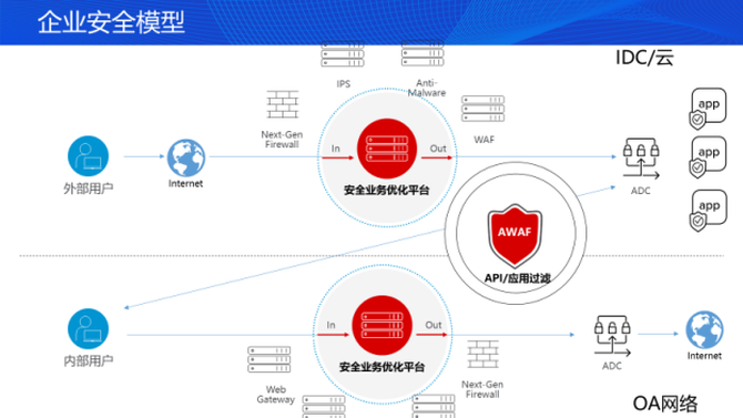 最后,在整个网络与数据中心或云端通讯过程中,将由AWAF产品对内容和应用层进行过滤。