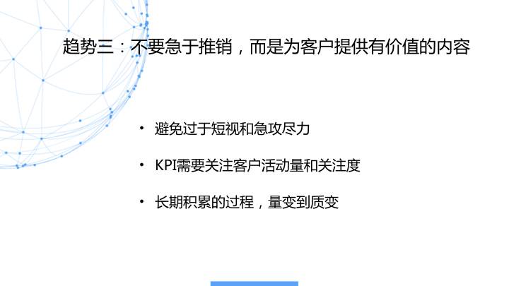 需要注意的是,输出有价值的内容是前提,但节奏也是必不可少的。不同阶段推给客户的内容应该不同,譬如,最开始推送简洁的内容,后期肯定要有方案和专业文章。