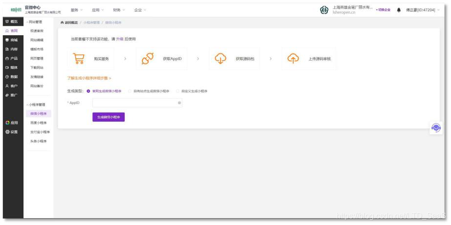 2/ 在官微中心选择「官网生成微信小程序」,通过提供 AppID 一键生成官网的小程序源码包。