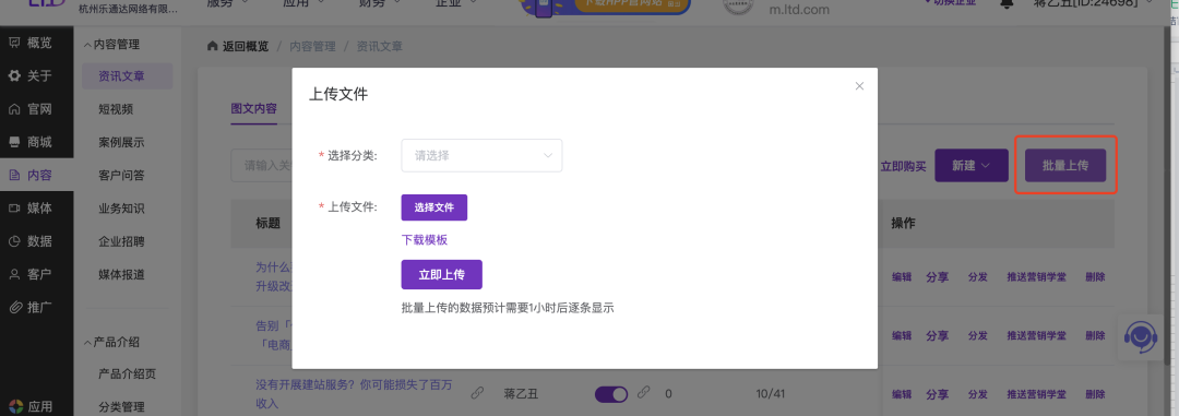 选择右上角的「批量上传」,跳出批量上传的弹窗,在这里,下载批量上传模板文档。