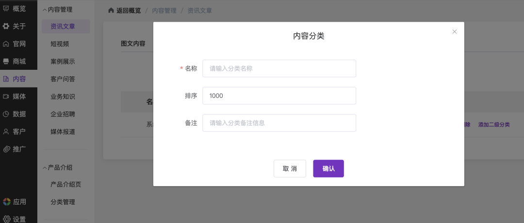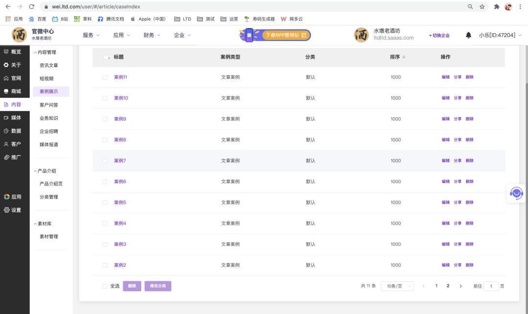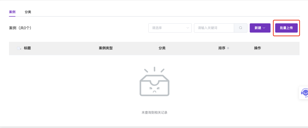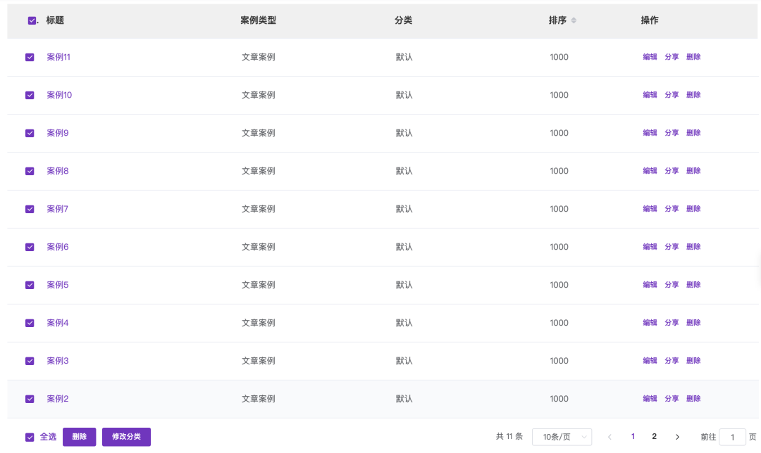 视频、案例、客户问答、业务知识、媒体报道、产品介绍页支持批量更改分类和删除。