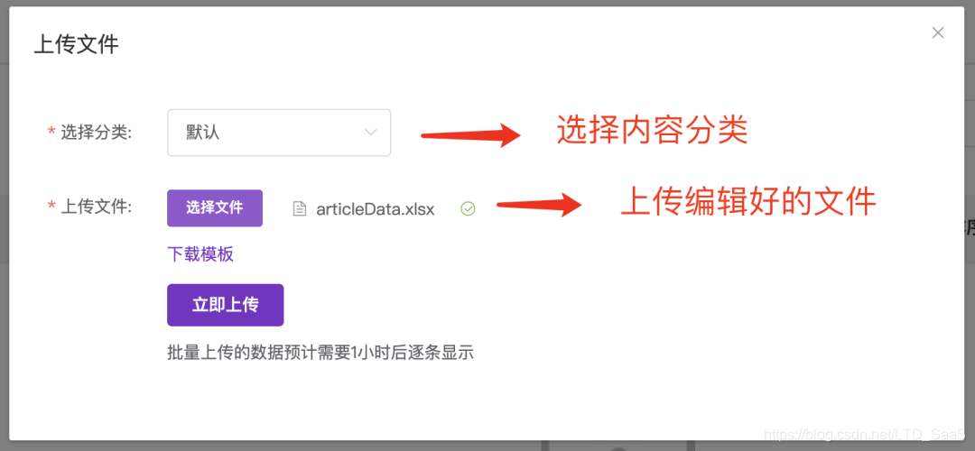 返回浏览器,选择分类,上传编辑好的模板文档,点击「立即上传」,等待系统将所有条目上传。