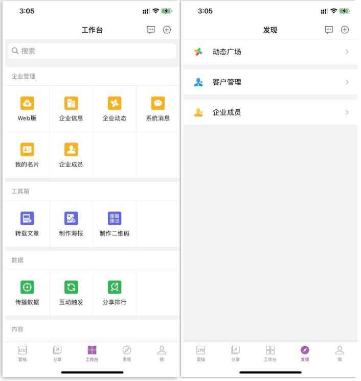 新增「工作台」,汇集官微中心所有需要用到的功能;「发现」可以在此管理客户与企业成员,也可在「动态广场」发布企业动态,或查看其他企业的动态。