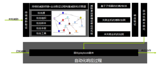 基于SOAR,针对已知威胁,通过已经编排固化的playbook剧本,实现对威胁的自动化处置闭环;对于未知威胁,根据MDR step-by-step的取证过程,依据威胁的紧迫度等实现响应动作优先级的,并针对响应设备进行编排,下发响应动作;