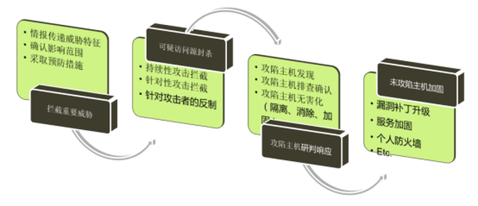 针对未知威胁尚未形成相应的playbook执行脚本时,系统在威胁研判过程逐步形成的威胁证据链,依据威胁的紧迫度及危险程度等条件,依据响应优先级(优先级从高到低:阻断传播路径-清除-加固)调用微场景化的通用playbook执行脚本,实现对威胁的全局封堵、被感染主机的威胁清楚及被影响主机的加固过程等。微场景化的通用playbook脚本包括: