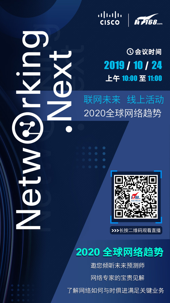 【IT168 评论】10月24日上午10点,思科将推出以“Networking.Next 联网未来”为主题的线上活动。届时,业界知名未来预测师和网络专家将围绕三大主题进行热烈探讨,观看直播以及获取更多精彩内容请扫码观看: